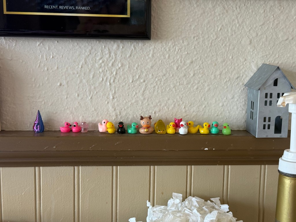 Today was both lazy and productive. I made returns, ran errands, and even chipped away at grading. I went to the park and watched ducks live their best, responsibility-free lives. Then I stopped at a coffee shop that had tiny plastic ducklings, which felt both comforting and slightly unhinged. Picture down below.